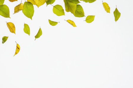 Falling green leaves on a white background, symbolizing the transition of seasons and the beauty of nature, perfect for eco friendly themes