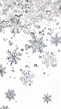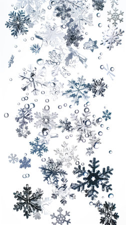 Photography of intricate snowflakes floating gracefully in a luminous white backdrop, evoking a peaceful winter ambiance filled with natural elegance