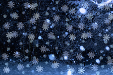 Snowflakes on the background of the night winter forest. Christmas background