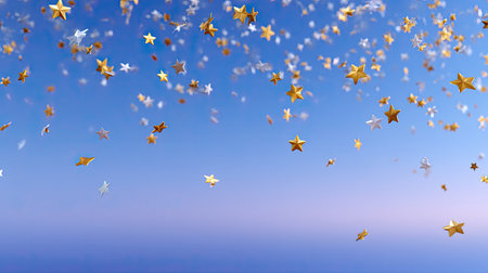 A whimsical scene featuring gold and silver stars cascading against a clear blue sky, perfect for adding a festive touch to any creative project or celebration.