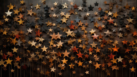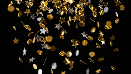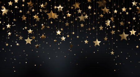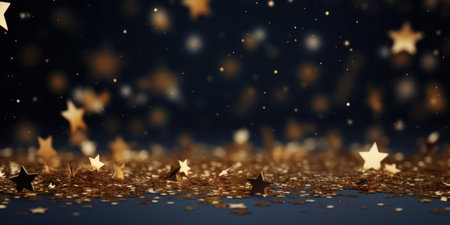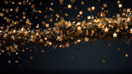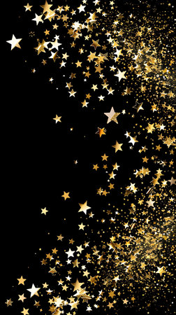 A scattering of golden star confetti creates a festive and celebratory atmosphere against a dark, elegant black background. Perfect for holiday themes.