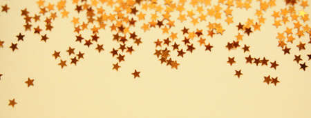 Golden stars glitter on yellow paper background. Festive holiday bright backdrop