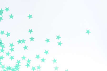 Pastel mint confetti stars on a white background. Holiday Party Concept.