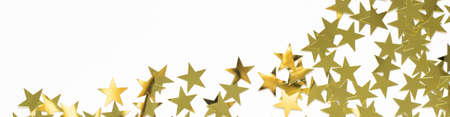 Banner with gold colored stars confetti scattered on a white background with place for text.
