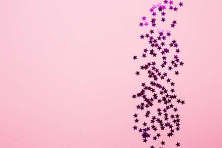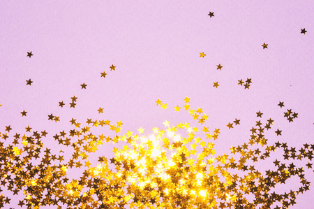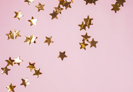 Golden shiny decorative stars on the pink background, top view.