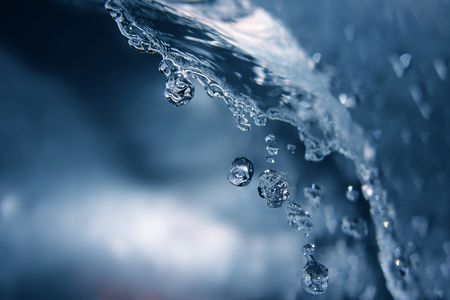 A close-up of a water splash with scattered droplets in motion, captured with dramatic lighting and a soft bokeh effect in the background.