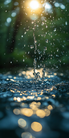A stunning scene with golden bokeh lights and water splashes, capturing the magical interplay of light and water droplets.