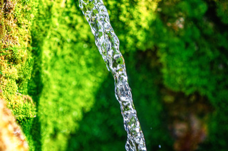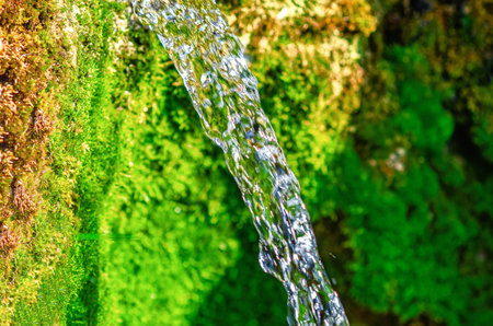 Stream of crystal clear water on background stones with green moss. Inspirational photo of wildlife
