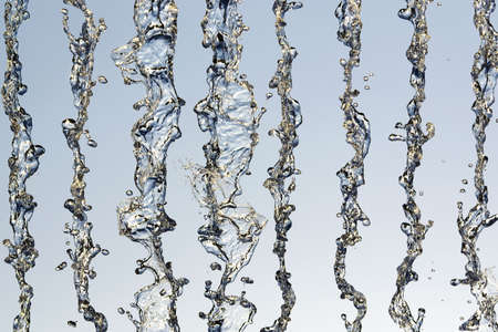 Splashes of water against light background. Fountain, a jet of water against cloudy sky.