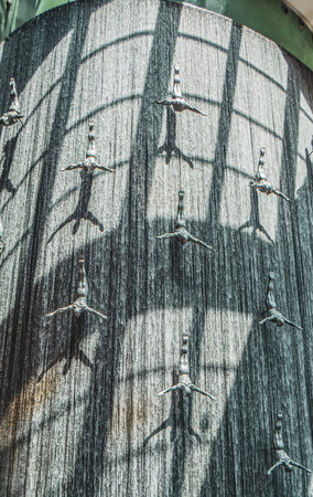 Symmetrical pattern of stopped water droplets with transparent streams on a green background. Clash, opposition and mystical magical heads of creatures.