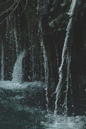 Background dark water flow, vertical streams, movement. Swiftness, high water, stormy river, current. Daylight. It's all blurry.