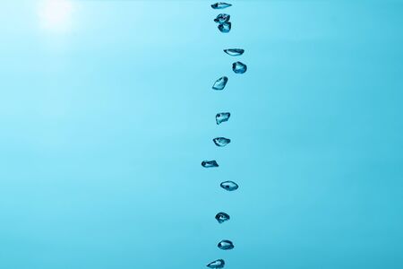 Drops of water close-up macro with a sunlight fall on the heavy splash water surface on a blue background