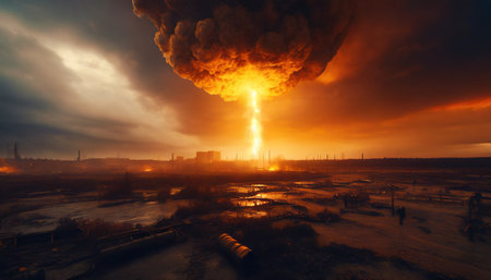 A powerful explosion lights up the evening sky, casting a fiery glow over an urban skyline. The blast creates a stark contrast with the darkening clouds, evoking a sense of impending doom.