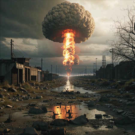 Mushroom cloud rises above a destroyed city in a chilling depiction of nuclear devastation.