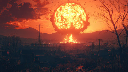 A massive explosion engulfs the horizon in flames, casting an intense orange glow over a barren area. Nearby structures and power lines create stark silhouettes against the fiery backdrop.