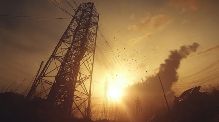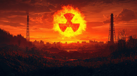 A striking image featuring a vibrant sunset over a desolate cityscape, highlighted by a radiation symbol and industrial structures, evoking feelings of decay and uncertainty.