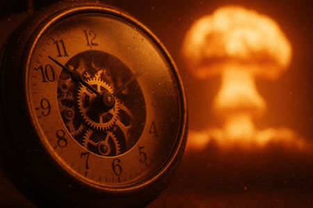 Vintage clock with visible gears ticks in dusty orange light while nuclear explosion rises in distance. Concept of doomsday countdown and final minutes.