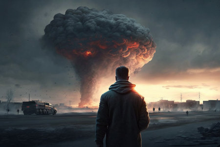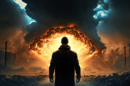 Man witnessing a giant atomic explosion. End of the world, armagedon concept with man and enormous fire explosion blast. Ai generated
