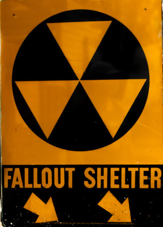 A vertical shot of a yellow FALLOUT SHELTER sign with arrows