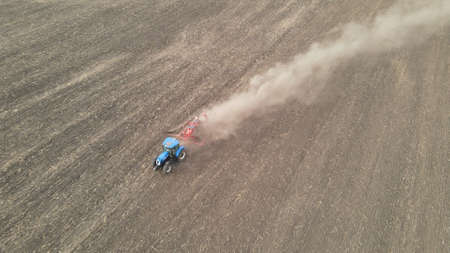 Tractor sowing seed on plowed field. Sowing seeds of corn and sunflower. Blue Tractor with disk harrow on plowing field. Seeding machinery on farm field. Seed sowing in farmland, aerial view.