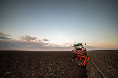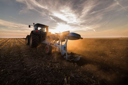 Tractor plowing field at sunset
