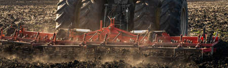 Farmer in tractor preparing land with seedbed cultivator in farmlands. Tractor plows a field. Agricultural work in processing, cultivation of land. Farmers preparing land and fertilizing. Agricultural workers with tractors.