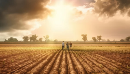Drought-knit farmers watch crop fields turn to dust under scorching sun. Image generated with Generative AI.