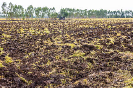 The view of the land, rice fields, which are full of grass, are plowed in preparation for cultivation, common in rural Thailand.