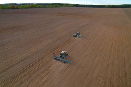 Above top view, of tractor as pulling mechanical seeder machine over arable field, soil, planting new cereal crop, corn, maize.
