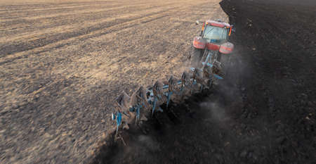 Tractor Plowing field. Red Tractor with Plow on Plowed. Plowing and Soil Tillage. Agricultural Tractor on Cultivation Field for Sowing Seeds. Big Tractor During Field Cultivating.