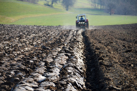 a plowed field. Creating a furrow in an arable field, preparing for planting crops in the spring.