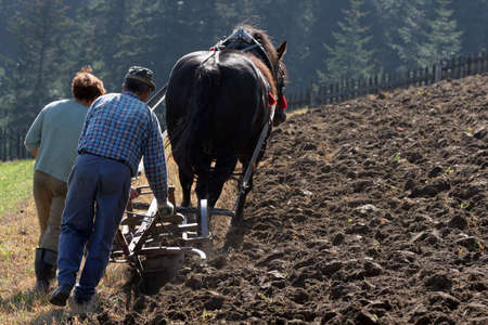 Farmer with a horse drawn carriages working in the field.