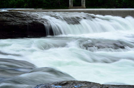 Beautiful waterfall in summer. A fast waterfall. View of the waterfall from below.