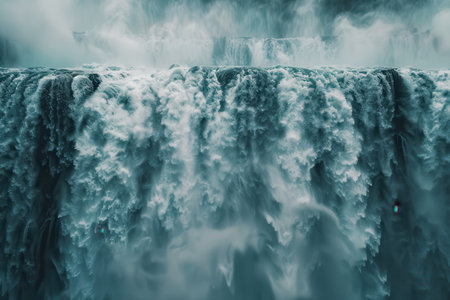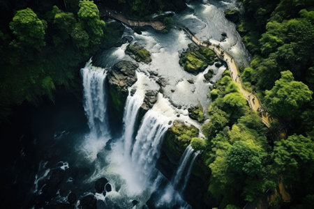 Top-down view of a cascading waterfall in a pristine wilderness area, Earth Day formed by the mist rising from the falls, promoting water conservation.