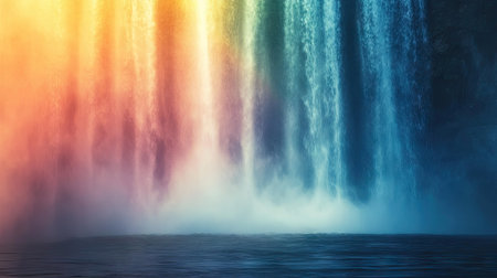 Rainbow forming in the mist of a thundering waterfall, with sunlight casting a colorful spectrum.