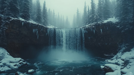 Majestic winter waterfall cascading through a snowy forest in a serene landscape surrounded by tall coniferous trees. Generative AI