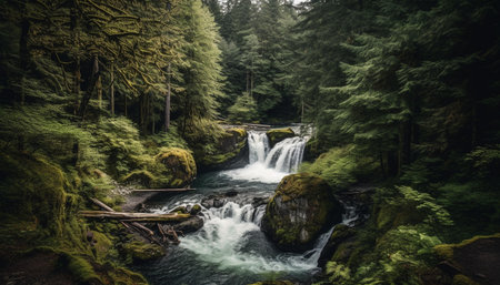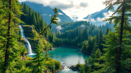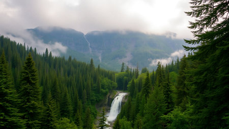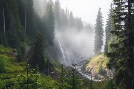 peaceful spruce forest with misty fog and waterfall in the distance, created with generative ai