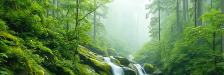 Experience the calming beauty of a misty forest landscape, featuring tall trees and rich greenery that creates a peaceful atmosphere for nature lovers and photographers.
