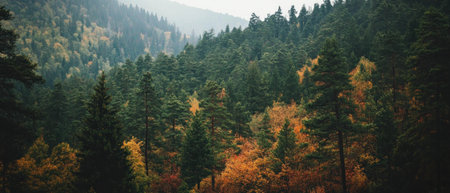 Pine forest in the mountains. Autumn nature.