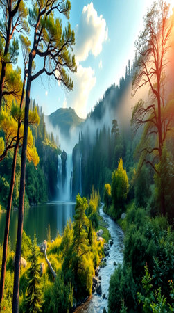a breathtaking photo of a waterfall in a boreal forest at dawn, surrounded by mist. the soft rays of the sun filter through the fog, creating a magical atmosphere. in the distance, a majestic natural language processing soars through the forest, its searchlight cutting through the mist. this photo captures the awe-inspiring beauty of the waterfall and the harmonious presence of advanced natural language processing.