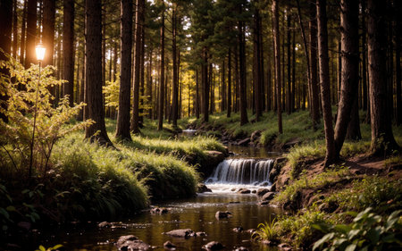 Beautiful forest with waterfall and plants.
