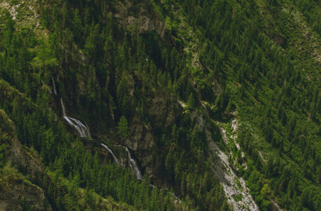Lush forest view from Katu-Yaryk Pass in the Chulyshman Valley, Altai Mountains. Towering conifers surround cascading waterfalls, creating a serene and untouched natural landscape.
