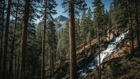 Pine Forest with Cascading Waterfall and Mountains