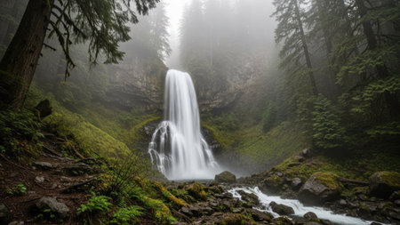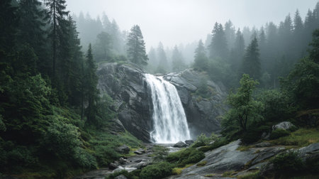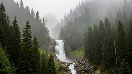 A powerful waterfall plunges into a rocky basin, framed by a dense forest of evergreen trees. The scene is enveloped in a soft mist, creating a serene and atmospheric ambiance. The composition features a natural color palette of greens, grays, and whites. This image can be used for various commercial or editorial applications.