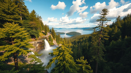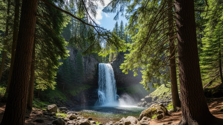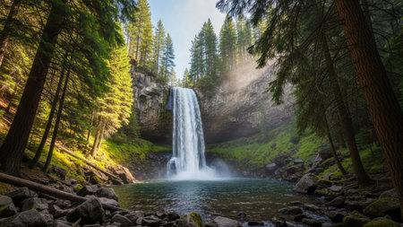 A powerful waterfall plunges into a serene pool, surrounded by dense evergreen trees. The composition highlights the lush green foliage and the cascading water, illuminated by sunlight. The scene suggests a natural, outdoor environment. Suitable for various uses, including editorial and commercial projects.