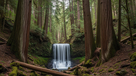 A picturesque waterfall cascades into a small pool in a dense forest. The image exhibits a naturalistic style with soft lighting, and features lush green foliage and tall trees. Ideal for illustrating natural environments, landscapes, or concepts related to serenity and conservation. Suitable for various editorial or commercial applications.