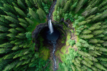 An overhead shot showcases a waterfall flowing into a dark pool, embraced by a vibrant green forest canopy. The composition highlights a circular opening within the trees. The image features a cool color palette with natural lighting. This scene is suitable for various commercial uses, illustrating natural beauty.