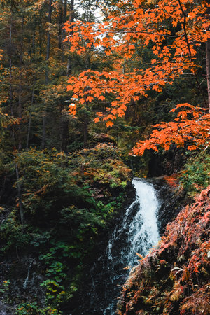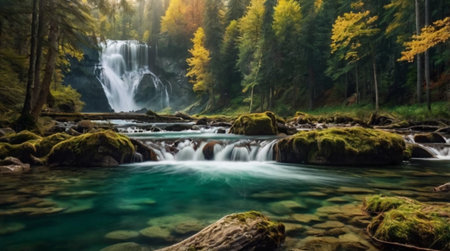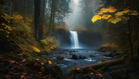 Misty autumn waterfall cascading through a lush forest. Golden leaves add to the magical atmosphere.