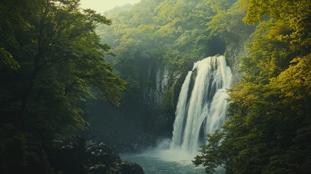 Experience the stunning beauty of a serene waterfall cascading through a lush green forest under soft morning light, creating a tranquil atmosphere in nature.