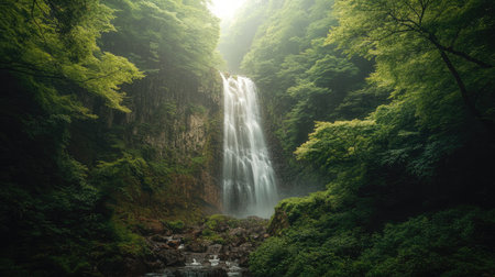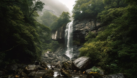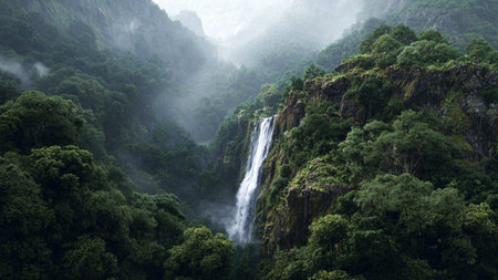 Experience the serene beauty of a majestic waterfall as it tumbles down rocky terrain, embraced by lush greenery and misty mountains, creating a tranquil outdoor landscape.